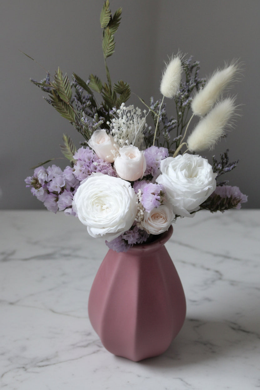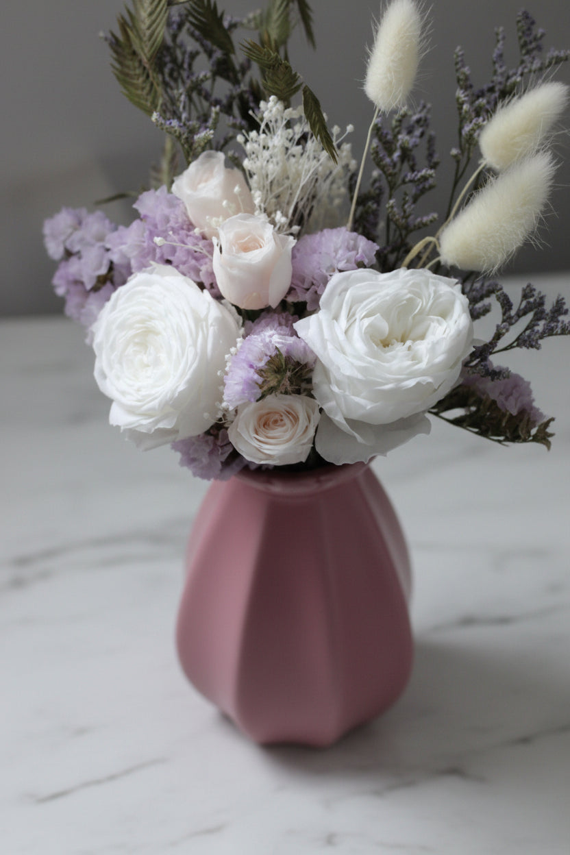 Gift set featuring preserved English roses and bud roses with delicate dried flowers, arranged in a soft pink ceramic vase.