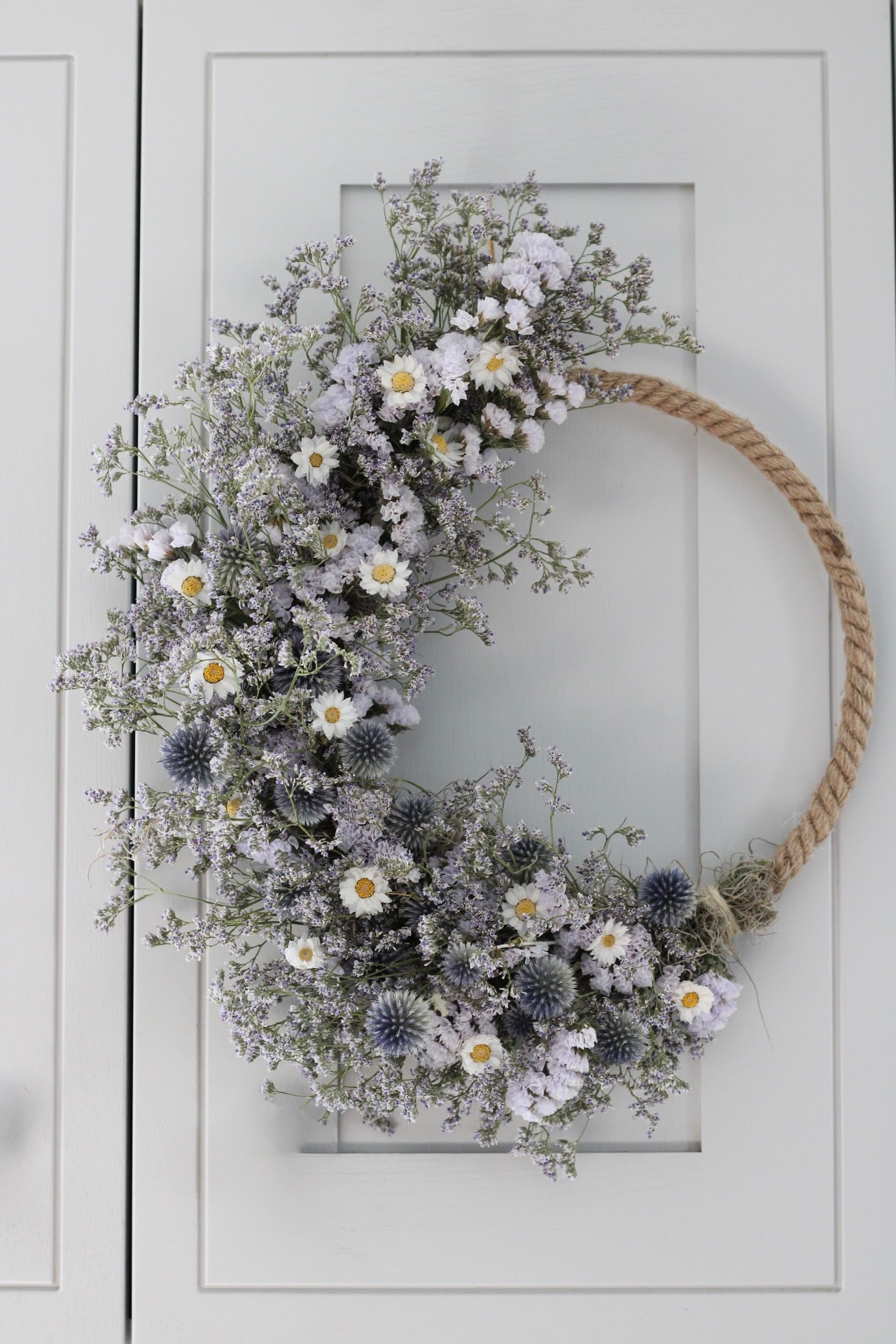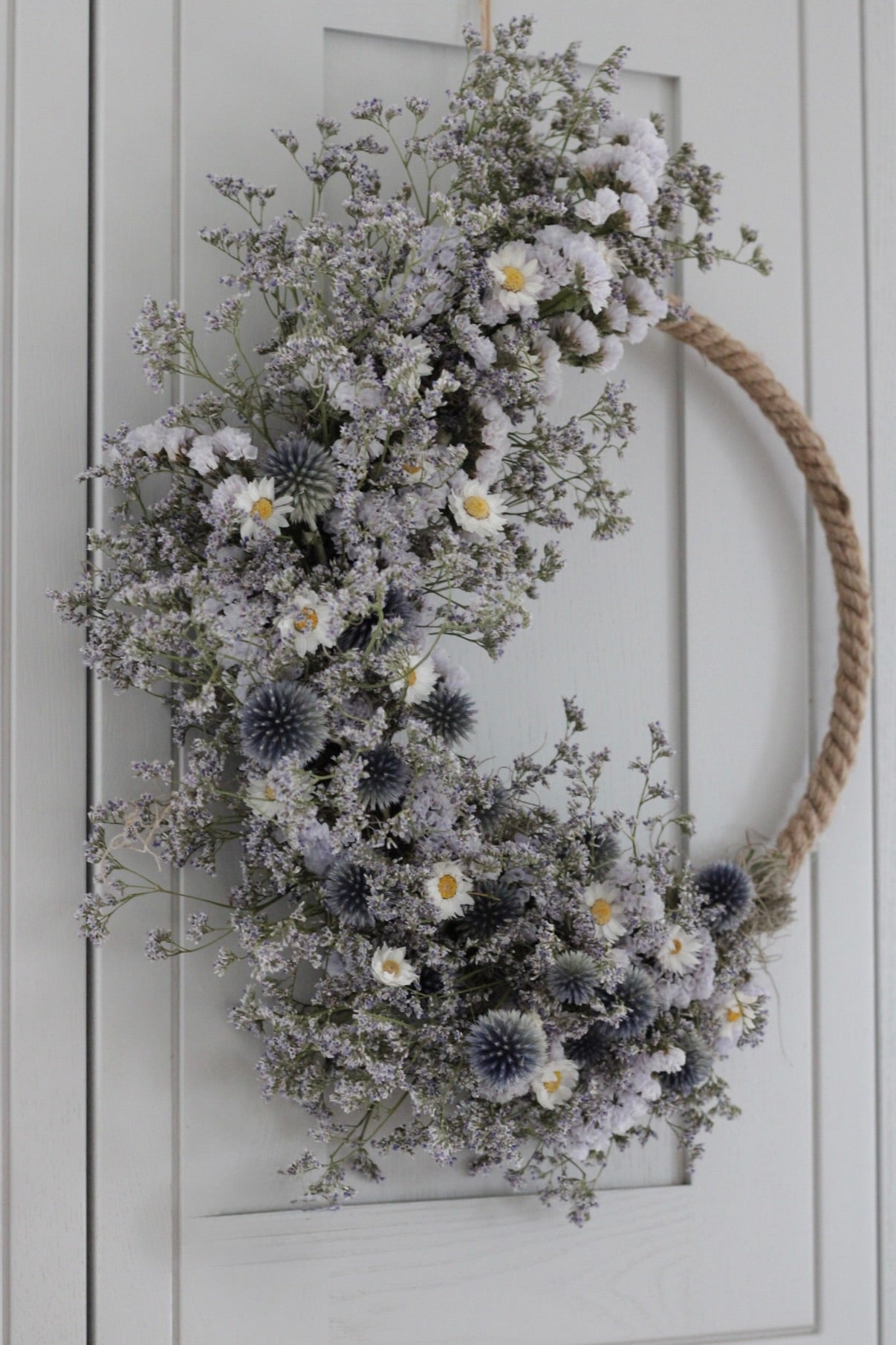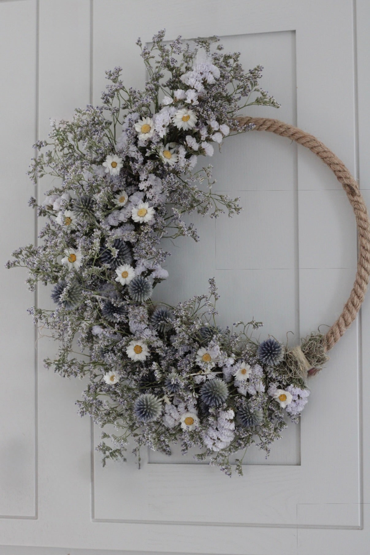 A large, dreamy, airy statement piece in delicate shades of blue, lightly sprinkled with handcrafted Paper Daisies. This one-of-a-kind design is arranged on a 35 cm rope ring, with layers of vibrant statice, globe thistle, and Spanish moss creating natural depth and a soft, cloud-like texture. Hang it on a wall to enjoy months of effortless beauty and gentle elegance.