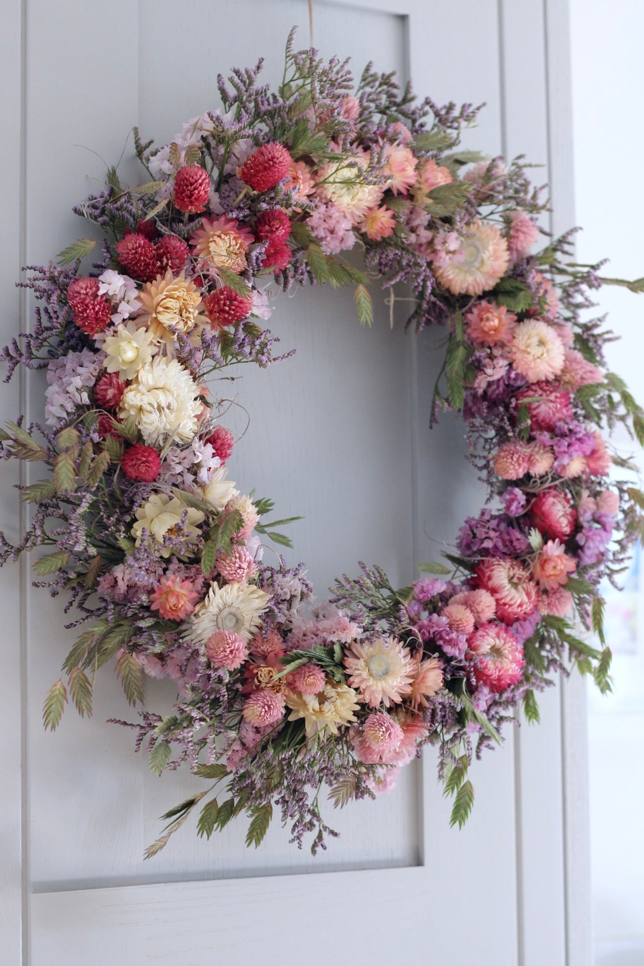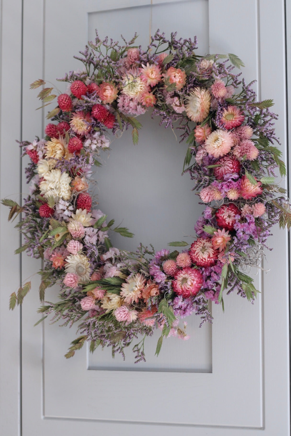 Iris Wreath — A one-of-a-kind statement piece in soft ombré shades of pink and purple. Handmade on a 30cm ring and filled with helichrysum, statice, gomphrena, and soft grasses.