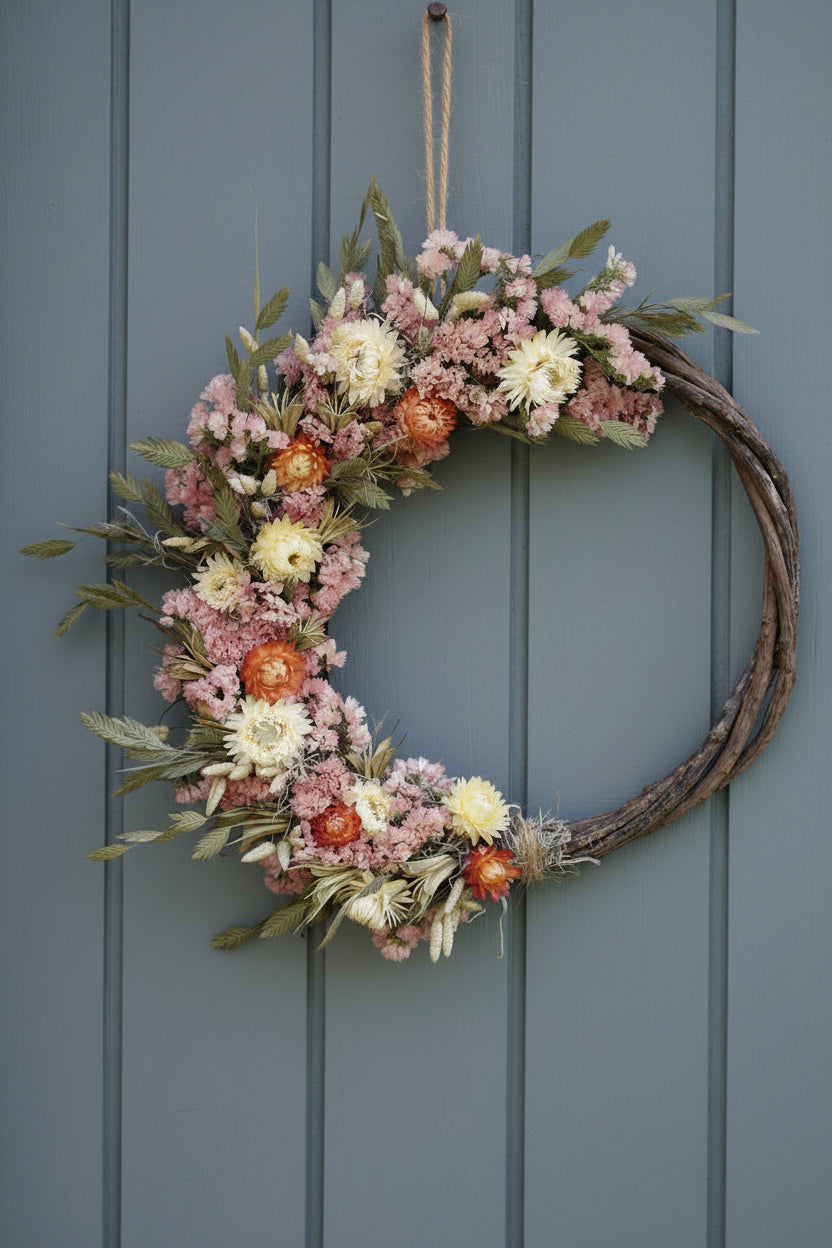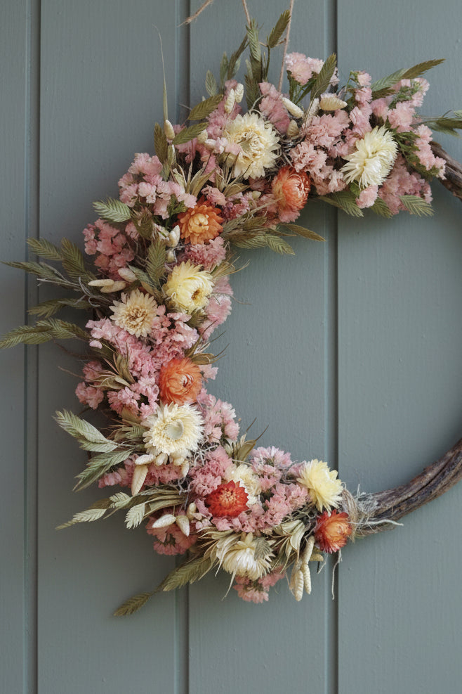 Luna is a handcrafted crescent moon wreath, arranged on a 30cm twisted vine ring with an abundant mix of dried and preserved florals in soft blush, warm cream and burnt orange, including pink statice, strawflowers, nigella pods and feathery grasses.