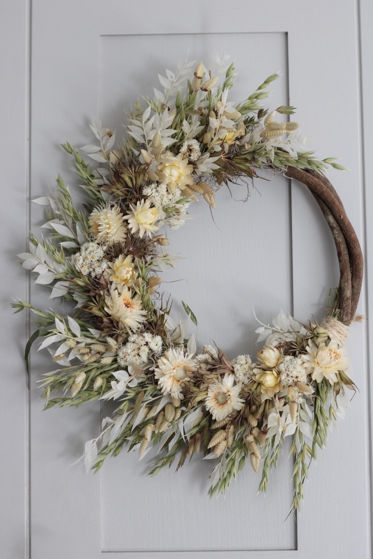 Lunaria Dried Flower Wreath — A delicate and timeless design in soft shades of neutrals. Handmade on a 25cm twisted vine base, it features strawflowers, oats, statice, Spanish moss and natural grasses for a beautifully textured look.