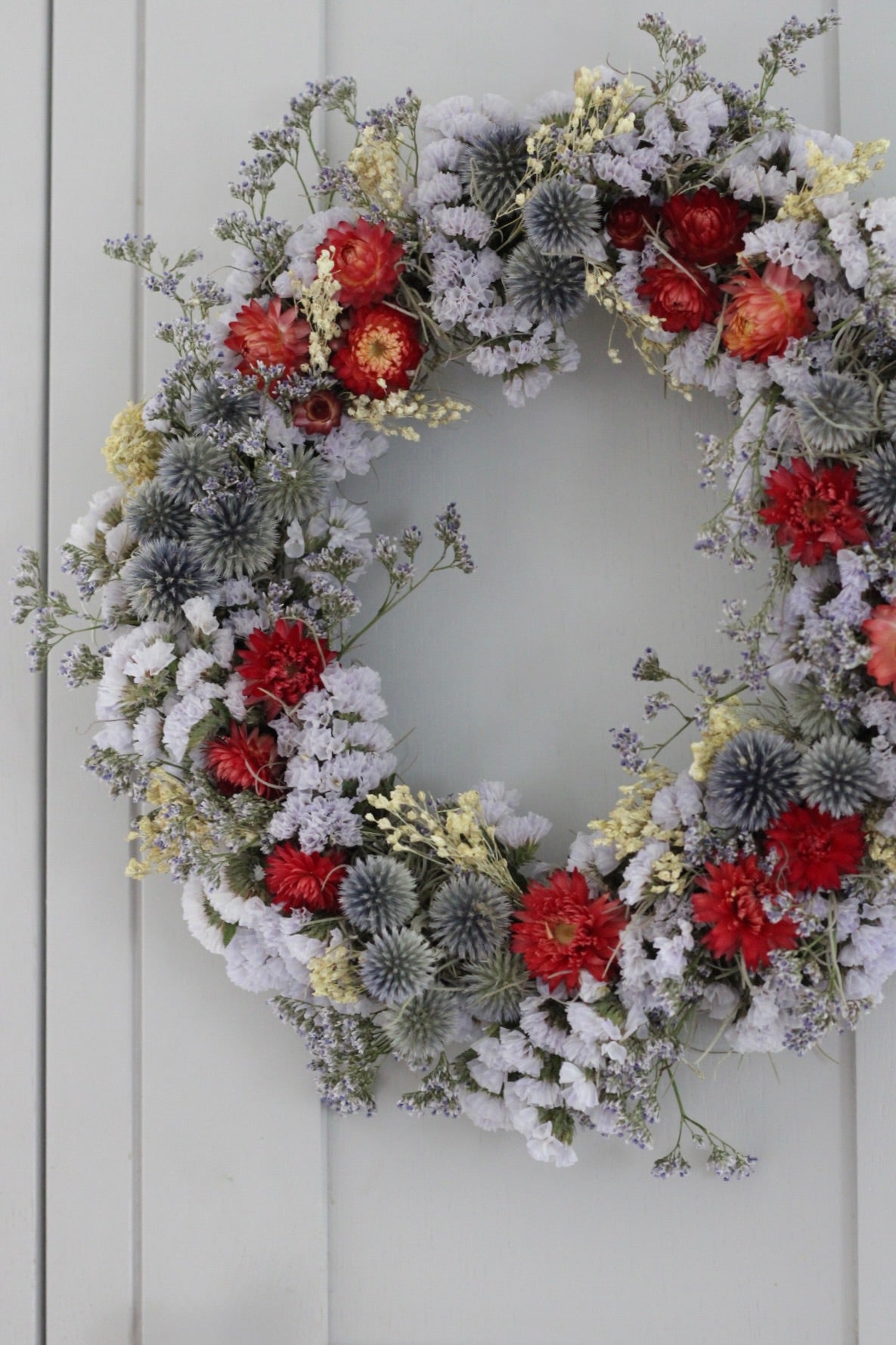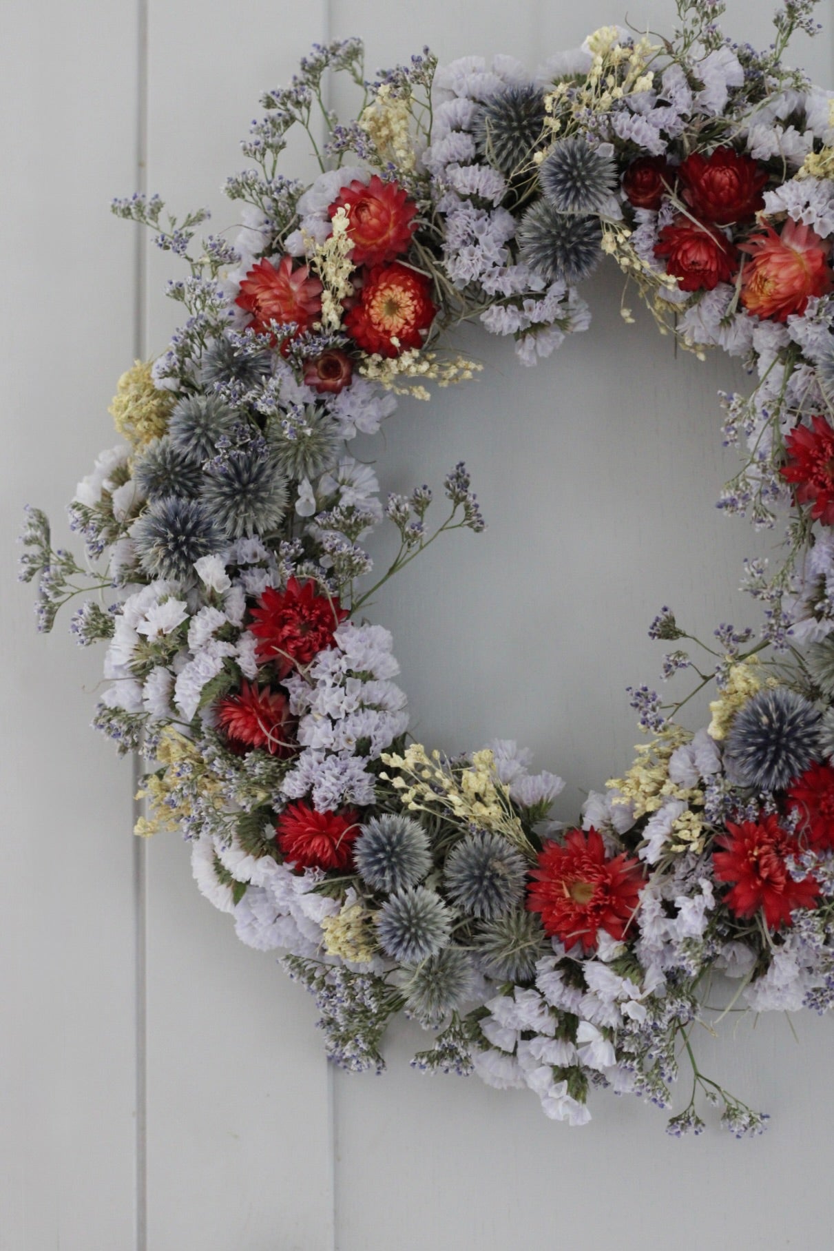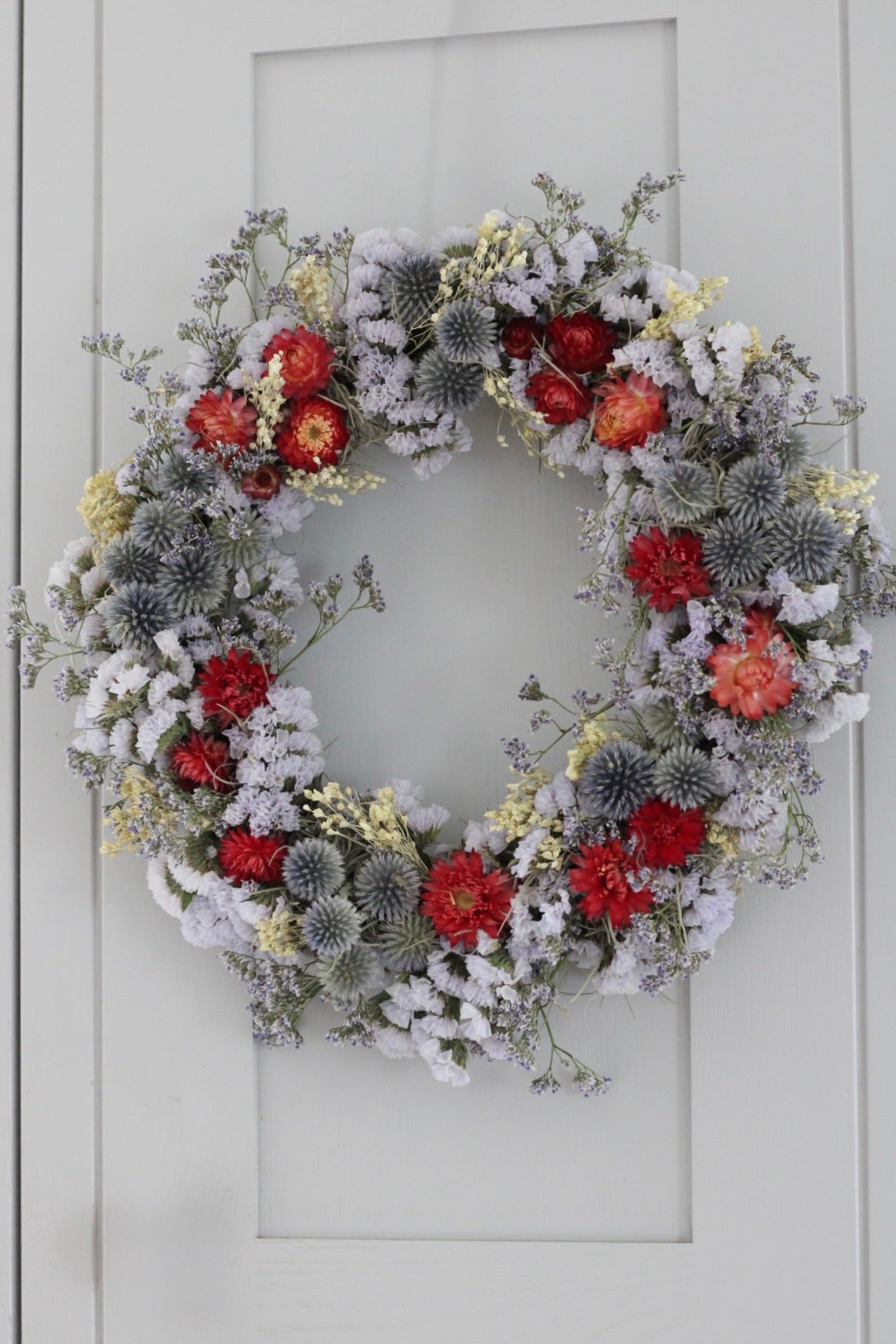 A dried flower wreath including pastel statice, Spanish moss, blue globe thistle, bold pops of red srawflower.