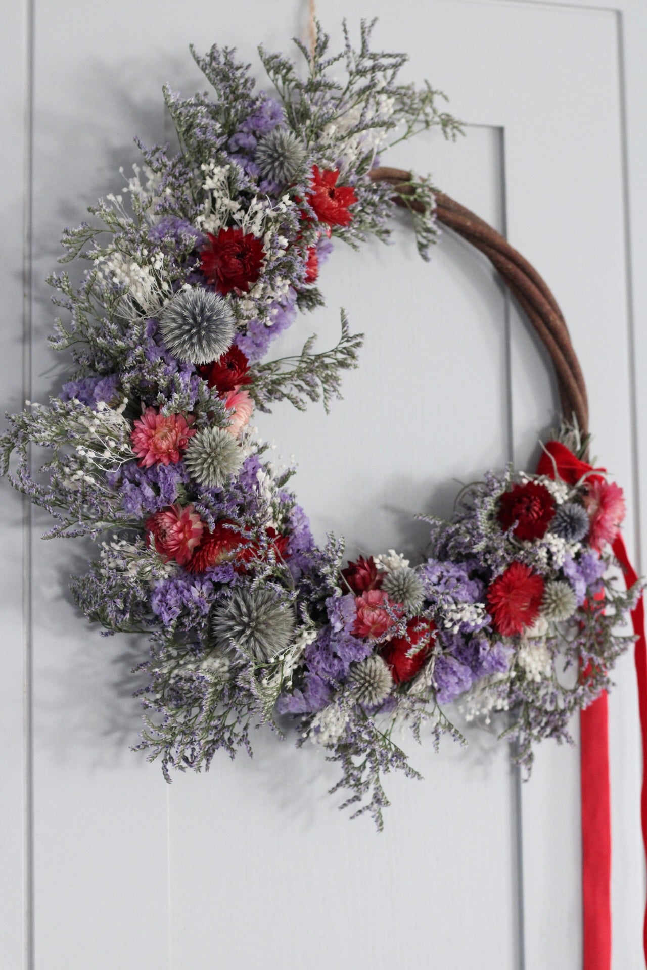 A dried flower wreath including statice, Spanish moss, blue globe thistle, bold pops of red strawflower.